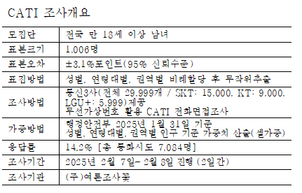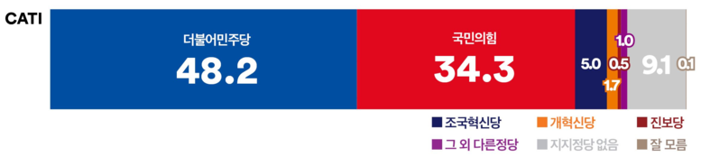 ‘여론조사꽃’이 2025년 2월 7일부터 2월 8일까지 이틀간 실시한 전화면접조사에서 ‘더불어민주당’의 지지율은 48.2%로 직전 조사 대비 2.2%p 하락한 것으로 나타났다. 반면, ‘국민의힘’은 34.3%로 변동이 없었으며, ‘조국혁신당’의 지지율은 5.0%로 1.5%p 상승한 것으로 조사됐다. 양당 간 격차는 13.9%p로 집계됐으며, ‘더불어민주당’과 ‘조국혁신당’의 합산 지지율(53.2%)은 ‘국민의힘’(34.3%)보다 18.9%p 앞서는 결과를 보였다.
