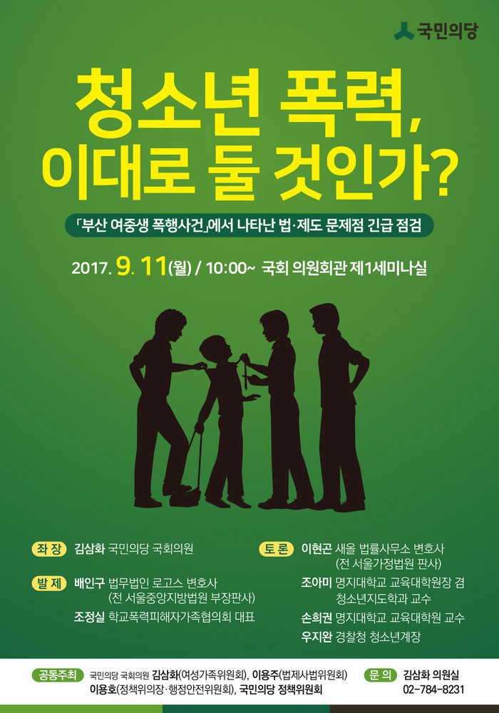 [부자동네타임즈 조영재 기자]국민의당 김삼화(환경노동위원회, 여성가족위원회), 이용주(법제사법위원회), 이용호 (정책위의장, 행정안전위원회) 의원, 국민의당 정책위원회는 오는 11일(월) 국회 의원회관 제1세미나실에서 ‘청소년 폭력, 이대로 둘 것인가?’국회토론회를 개최한다.
