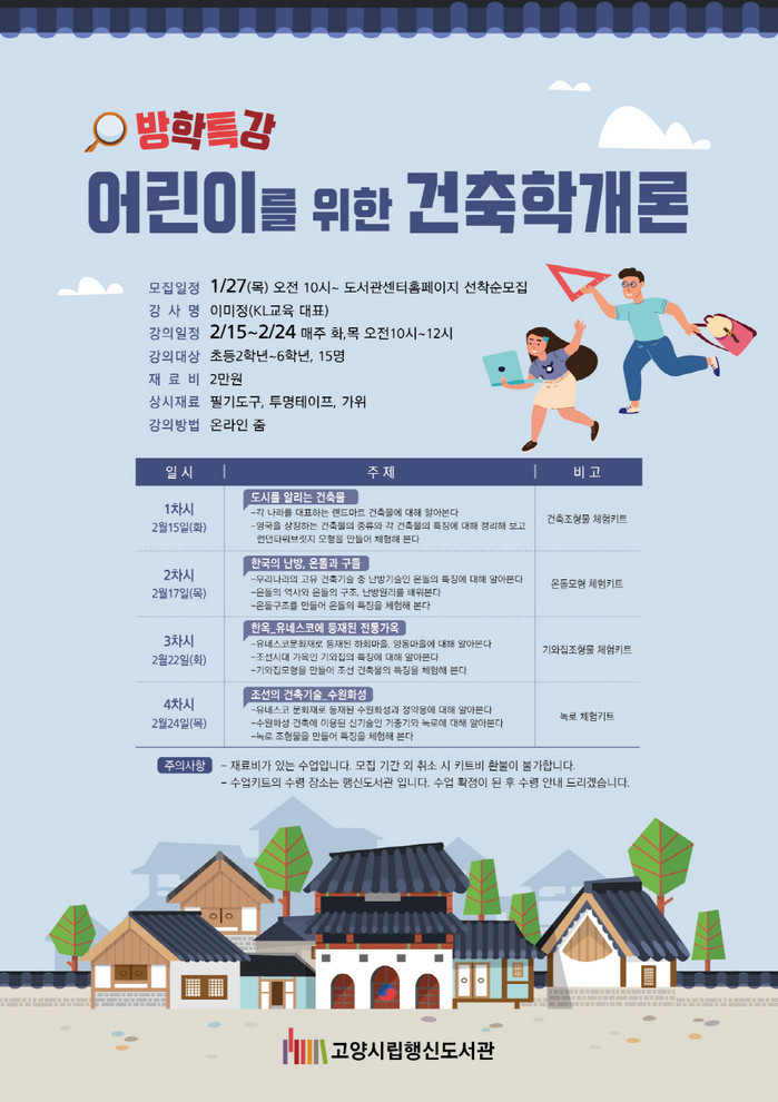 [부자동네타임즈 김인수기자] 고양시 행신도서관이 초등학생을 대상으로 2월 15일부터 방학특강 어린이를 위한 건축학개론을 운영한다.