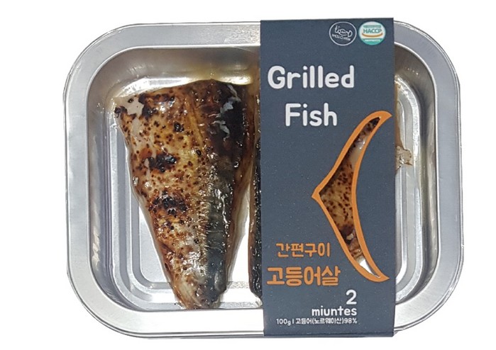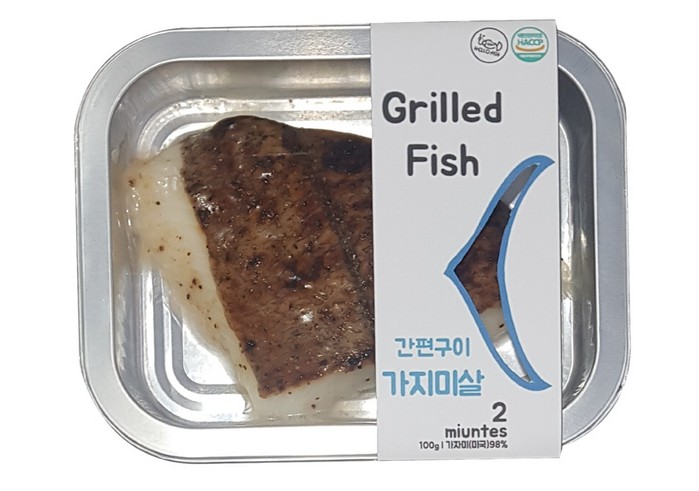 소포장생선구이 2종은 재활용이 가능한 알루미늄 용기에, 한 사람이 먹기 적당한 양(100g)의생선 토막 구이가 포장되어 있다.