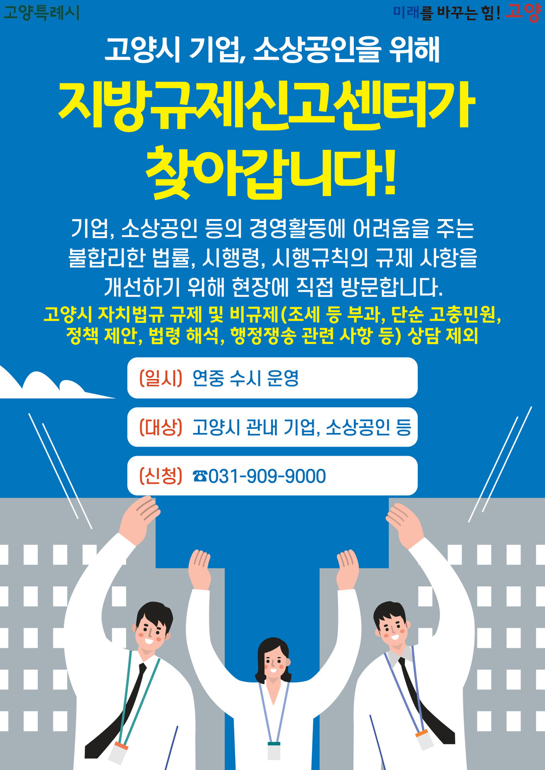 문의는 고양시 민원콜센터(☎031-909-9000)로 하면 된다. 단, 고양시 자치법규 규제 및 비규제(조세, 과태료 및 과징금 부과 징수, 보조금 등 재정지원, 고충민원, 법령해석 및 정책 제안, 행정규제로 볼 수 없는 사항)는 방문 상담에서 제외된다.
