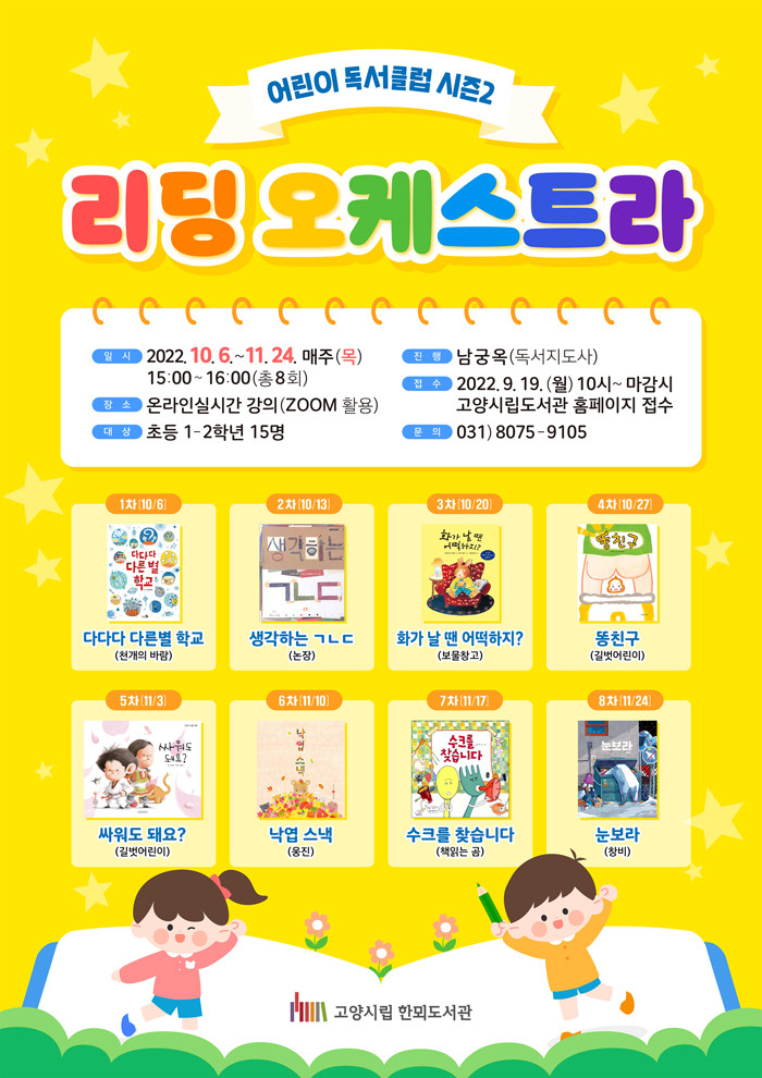 [부자동네타임즈 김인수기자] 고양특례시(시장 이동환) 한뫼도서관은 어린이독서클럽 시즌 2 리딩 오케스트라를 10월 4일부터 11월 24일까지 온라인으로 운영한다.