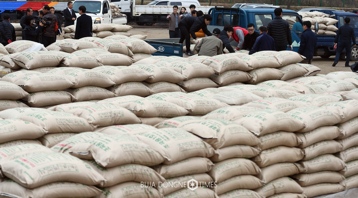 2016년산 공공비축 건조벼 수매가 진행된 14일 오전 경기 광주 퇴촌면 공설운동장에서 관계자들이 벼 포대를 옮기고 있다. 광주시는 올해 9,417포(포/벼 40kg)가 수매됐으며 2015년도 매입량 8,176포에 비해 1,241포 증가했다고 밝혔다. 2016.11.14