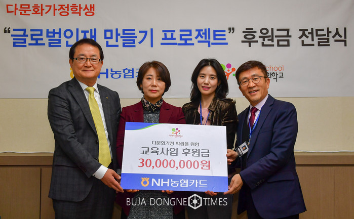 [부자동네타임즈 이현재 기자]NH농협카드는 지난 23일 서울시 강남구 소재 다애다문화학교를 방문해 다문화가정 자녀를 위한 교육사업 후원금 3천만원을 전달했다고 24일 밝혔다.
