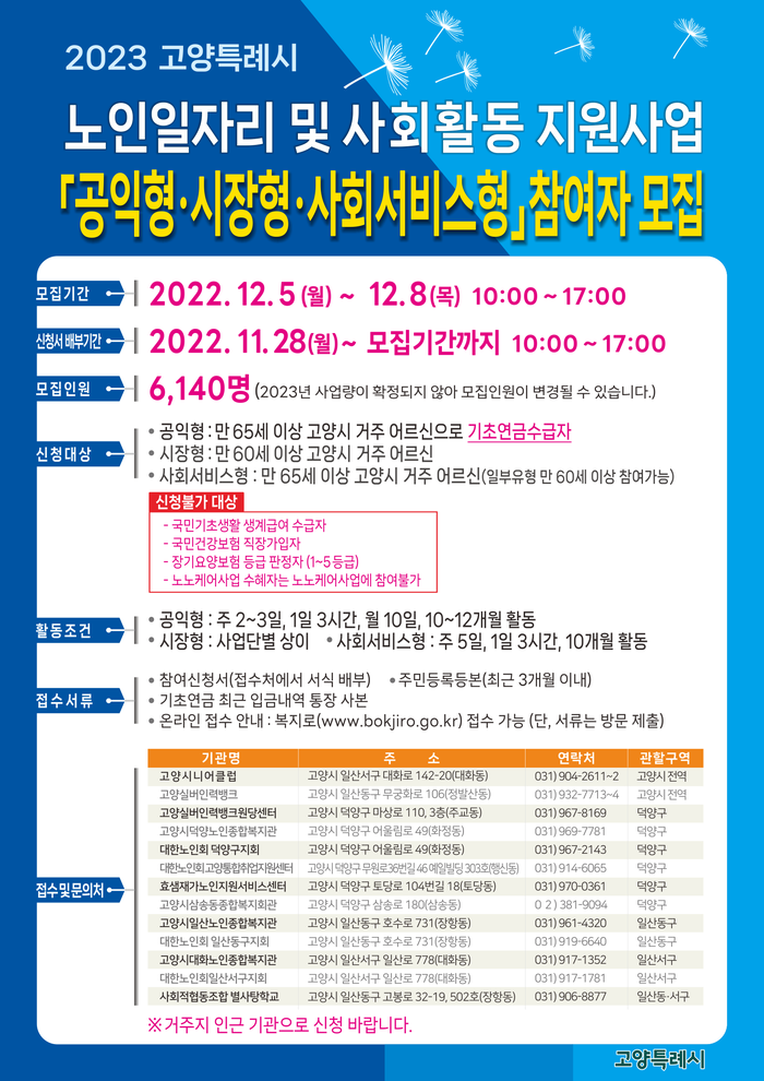 [부자동네타임즈 김인수기자] 고양특례시(시장 이동환)가 2023년 노인일자리 및 사회활동지원 사업을 통해 총 6,140명분의 노인일자리를 운영한다. 고양시는 12월 5부터 12월 8일까지 방문 접수 및 온라인 접수를 할 예정이다.