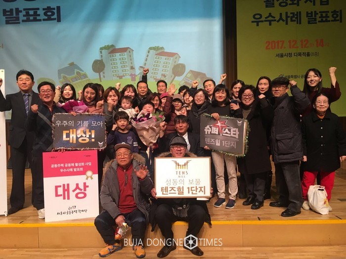 성동구(구청장 정원오)는 서울시 주최 ‘2017 서울시 공동주택 공동체 활성화사업’ 우수사례 발표회에서 텐즈힐 1단지 아파트, 신금호파크자이 아파트가 각각 대상과 은상을 받았다고 밝혔다.