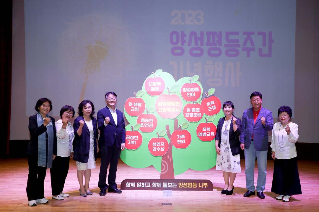 양성평등 문화 확산을 기원하는 퍼포먼스도 진행됐다. 내빈들은 ‘함께 일하고 함께 돌보는 양성평등 나무’에 ‘공정한 기회, ‘일·돌봄 공정분배’, ‘폭력 근절’, ‘성인지 감수성’라고 적힌 열매를 달며 실천 의지를 다졌다.