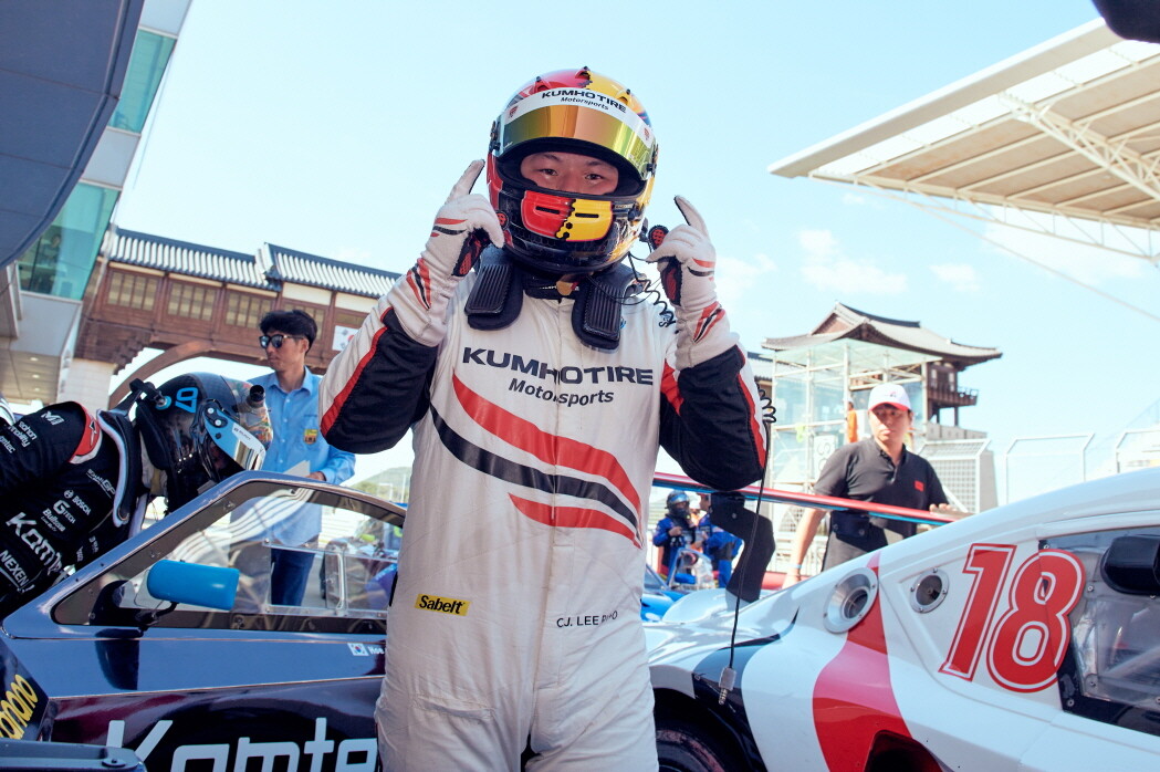 [사진 설명] 2023 CJ대한통운 슈퍼레이스 챔피언십 6라운드, 슈퍼 6000 우승자 이찬준이 승리 세리머니를 하고 있다.