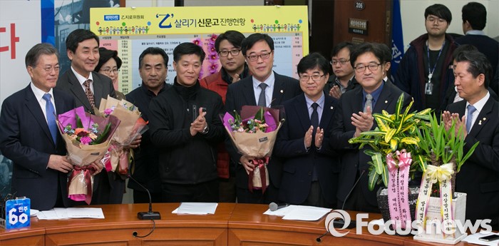 (서울=포커스뉴스) 문재인 새정치민주연합 대표, 이종걸 원내대표, 우원식 을지로위원장, 김기식 정무위 야당 간사 등 의원들과 관계자들이 4일 오전 서울 여의도 국회에서 최고위원회의에 앞서 열린 일명 '남양유업방지법' 처리 상생 꽃달기 행사에 참석해 기념촬영을 하고 있다.