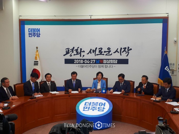 2018 남북정상회담은 북미정상회담의 길잡이 역할을 충분히 했으며, 문재인 대통령의 ‘한반도 운전자론’은 현실화되고 있음을 보여줬다. 전 세계의 언론과 국민들은 한반도를 주목했고, 두 정상의 모습에 놀랐고, 감동했으며, 특히, 미중일러 등 한반도 주변국은 남북정상회담의 성과에 환영과 지지를 아끼지 않았다. 앞으로 열릴 북미정상회담을 통해서 한반도 비핵화와 평화체제 구축을 위한 구체적인 성과와 실천을 도출해야 한다. 민주당 또한 남북정상회담을 통해 얻은 소중한 결실과 기회가 헛되지 않도록 하겠다. 판문점 선언이 불가역적이며 실질적인 효과를 거두기 위해 제반 제도화에 앞장설 것이며, 필요하면 국회비준도 검토하겠다. 또한 성공적인 북미정상회담으로 이어질 수 있도록 지원을 아끼지 않을 것이다.