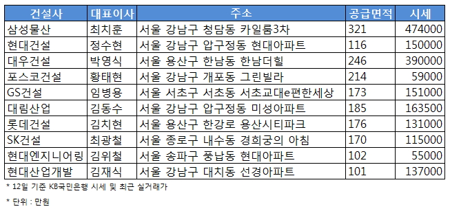 김치현 롯데건설 사장은 한강로3가 용산 시티파크 176㎡, 최광철 SK건설 사장은 종로구 내수동 경희궁의 아침 170㎡로 각각 13억1000만원, 11억5000만원선이다.