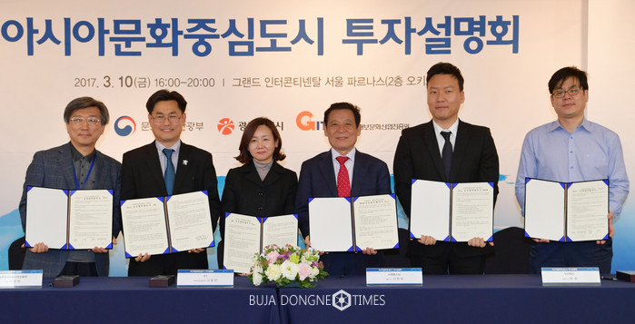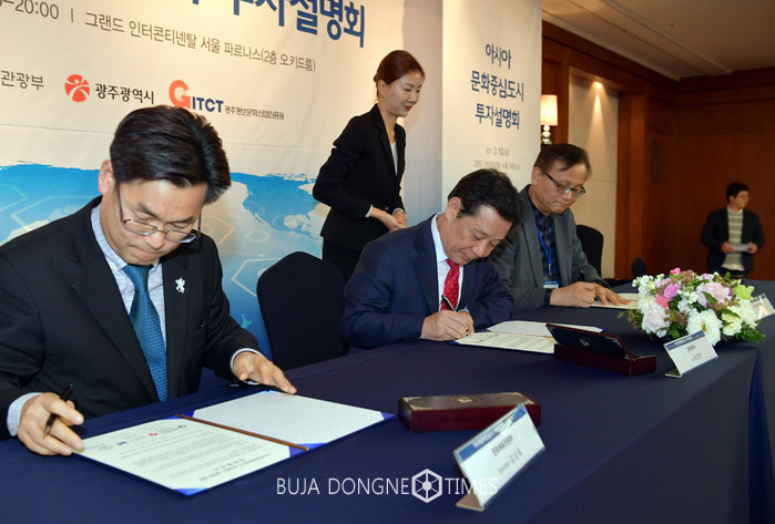윤장현 광주광역시장이 10일 오후 서울 그랜드인터콘티넨탈 호텔에서 열린'아시아문화중심도시 서울 투자설명회'에 참석해 광주광역시·문화체육관광부·마그나인베스트먼트(주)와 투자진흥지구 및 광주문화산업 투자활성화를 위한 참가 업체들과 업무협약을 체결했다.