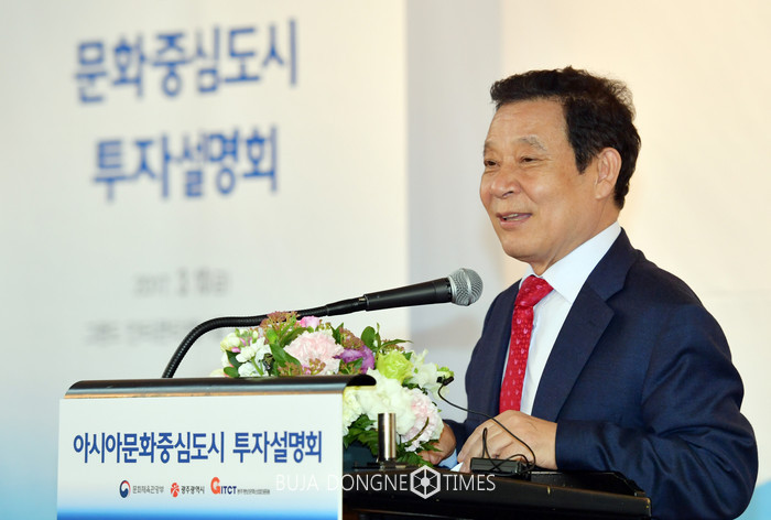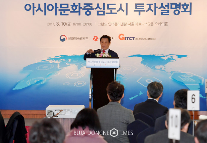 | △윤장현 광주시장은 광주광역시와 문화체육관광부가 공동으로 마련한 '아시아문화중심도시 서울 투자설명회'에 참석해 인사말을 하고 있다 |