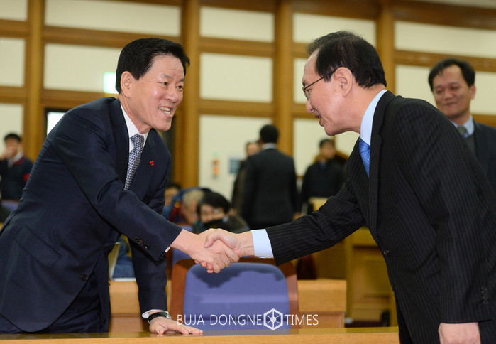 12일 오전 서울 여의도 국회 의원회관에서 열린 박근혜 정부 적폐청산과 개협입법과제 야 3당·퇴진행동 공동 토론회에서 국민의당 주승용(왼쪽) 원내대표와 정의당 노회찬 원내대표가 인사를 나누고 있다. 2016.01.12.