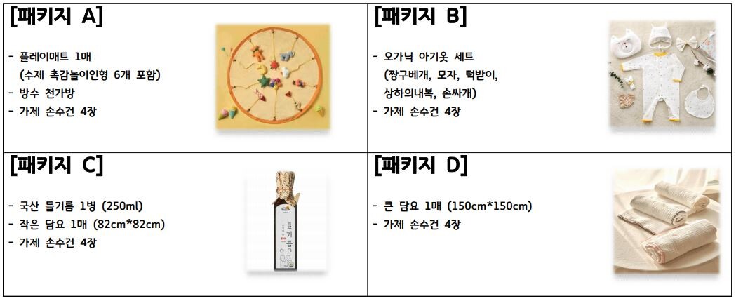 작년까지는 한 가지 품목으로 구성했으나, 2024년부터는 출산가정이 필요한 물품을 선택할 수 있게 4종류의 패키지를 선보인다.