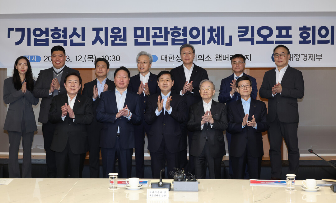 12일 서울 중구 대한상공회의소에서 열린 기업혁신 지원 민관협의체 킥오프회의에서 구윤철 부총리 겸 재정경제부 장관과 최태원 대한상공회의소 회장 등 참석자들이 기념 촬영하고 있다. 2026.3.12