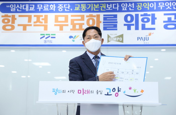 이에 16일 이한규 경기도 행정2부지사, 이재준 고양시장, 정하영 김포시장, 고광춘 파주부시장은 이날 오전 고양시청 본관에서 일산대교 통행료 징수금지 집행정지 가처분 인용결정에 대한 공동성명을 발표하고 일산대교(주)측에 통행료 무료화 수용을 촉구했다.