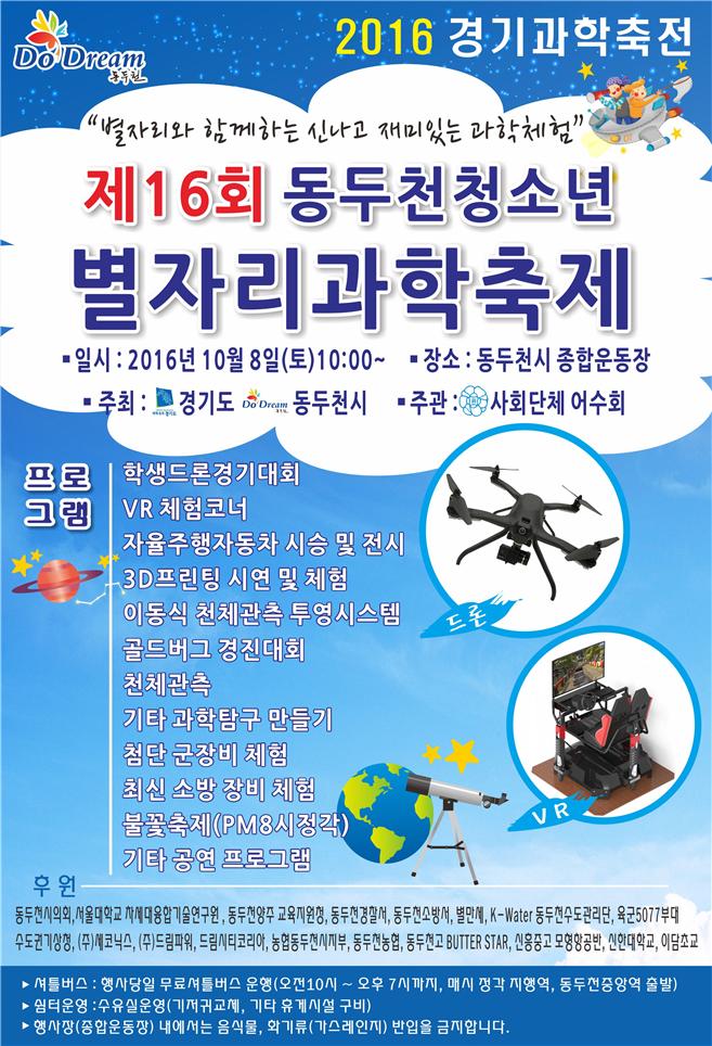 경기도와 동두천시는 오는 10월 8일 오전 10시부터 저녁 10시까지 동두천 종합운동장 및 보조경기장 일원에서 ‘2016 경기과학축전’을 개최한다고 29일 밝혔다.