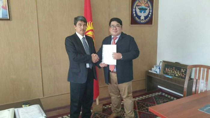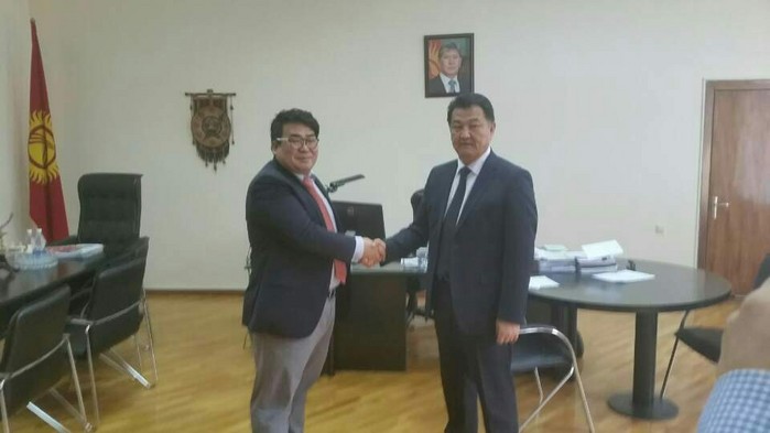 | △ 이병흥 주한 키르키스스탄 경제무역통상대표부 총괄 대표가 키르키스스탄 딸라스주 케네깨에브 시장을 만나고 있다. (사진=주한 키르키스스탄 경제무역통상대표부 제공) |