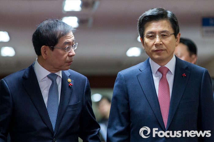 (서울=포커스뉴스) 1일 오전 서울 종로구 정부서울청사에서 열린 국무회의에 자리한 박원순(왼쪽) 서울시장이 회의장에 들어서며 황교안 국무총리에게 의견을 전달 하고 있다.