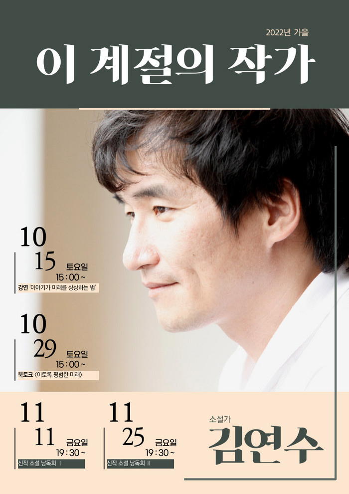 [부자동네타임즈 김인수기자] 고양특례시(시장 이동환) 아람누리도서관은 오는 11월 11일과 25일, 두 차례에 걸쳐 아람누리도서관 지하1층 강의실에서 이 계절의 작가 가을 편 초대 작가 김연수 소설가의 신작 소설 낭독회를 개최한다.