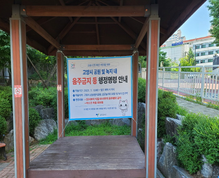고양시는 코로나19 확산 방지를 위한 공원 및 녹지 내 음주 금지 등 행정명령을 7월 13일부터 시행하고 있으며, 음주 금지 시간은 22시부터 익일 05시까지이다.