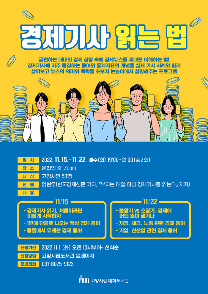 [부자동네타임즈 김인수기자] 고양특례시(시장 이동환) 대화도서관은 경제기사 읽는 법 강의 프로그램을 온라인 줌(zoom)으로 11월 15일부터 11월 22일까지 운영한다. 이번 강의는 경제기사, 경제 관련 도서를 읽는 일반 시민들에게 실질적인 도움을 주고자 기획됐다.