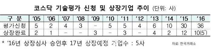 이에 유망 기술기업의 상장 활성화 추세가 지속되고 있다고 거래소는 진단했다. 앞서 기술평가 신청 기업은 ▲2012년 4개 ▲2013년 6개 ▲2014년 10개 ▲2015년 30개 ▲2016년 36개 등으로 꾸준히 증가 추세를 이어왔다.