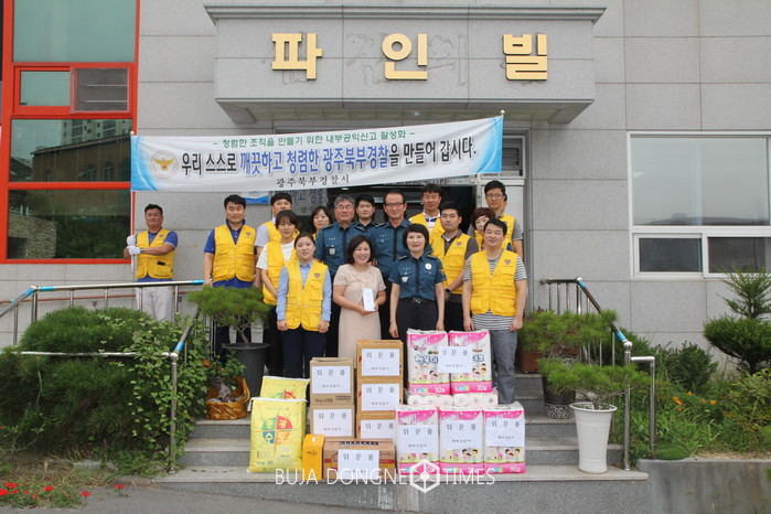 광주북부경찰서 직원들은 9월 7일 10시 30분경 추석을 맞아 우리 주변 이웃들과 따뜻한 정을 나누고자 북구 양산동에 위치하고 있는 사회복지 시설 '파인빌(소나무집)'을 위문방문 하였다. '파인빌(소나무집)'은 2011년 10월 개소하여 현재 약 20여 명의 지적장애인들이 직원 12명과 함께 생활하고 있다.