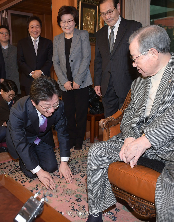 대선 출마를 선언한 유승민 바른정당 의원이 29일 서울 신당동 김종필 전 국무총리 자택을 예방, 김 전 총리에게 큰 절하고 있다. 2017.01.29.