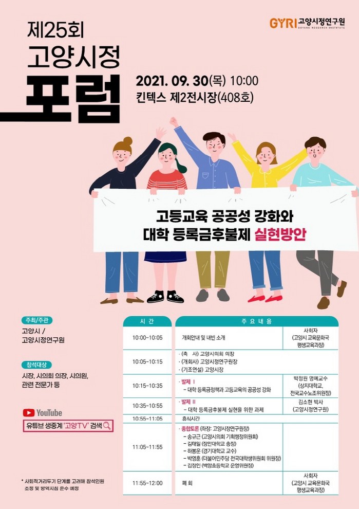 [부자동네타임즈 김인수기자] 고양시가 오는 30일 10시, 킨텍스 제2전시장 408호에서 고등교육의 공공성을 강화하고 대학등록금 완전 후불제 실현을 위해‘제25회 고양시정포럼’을 개최한다.