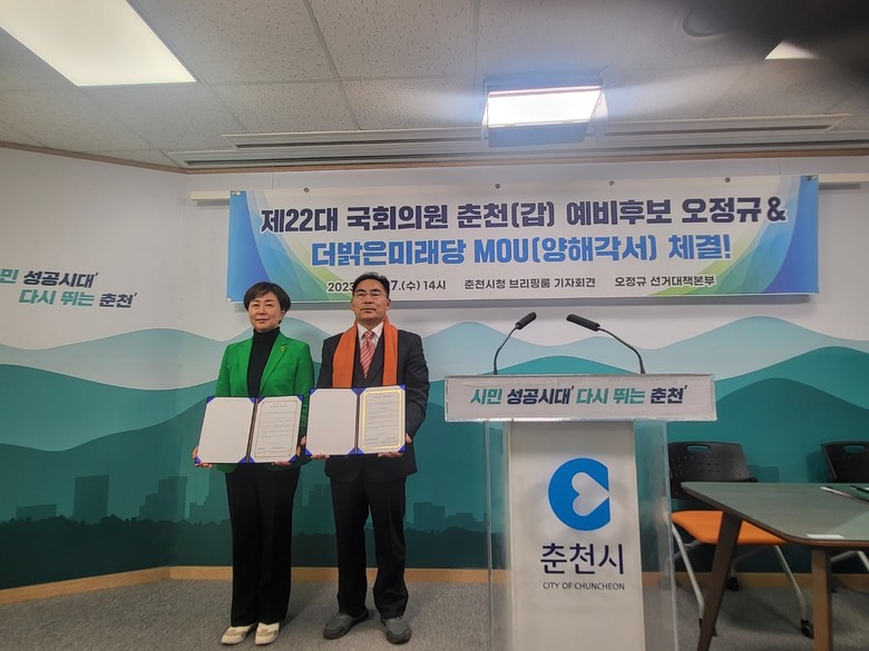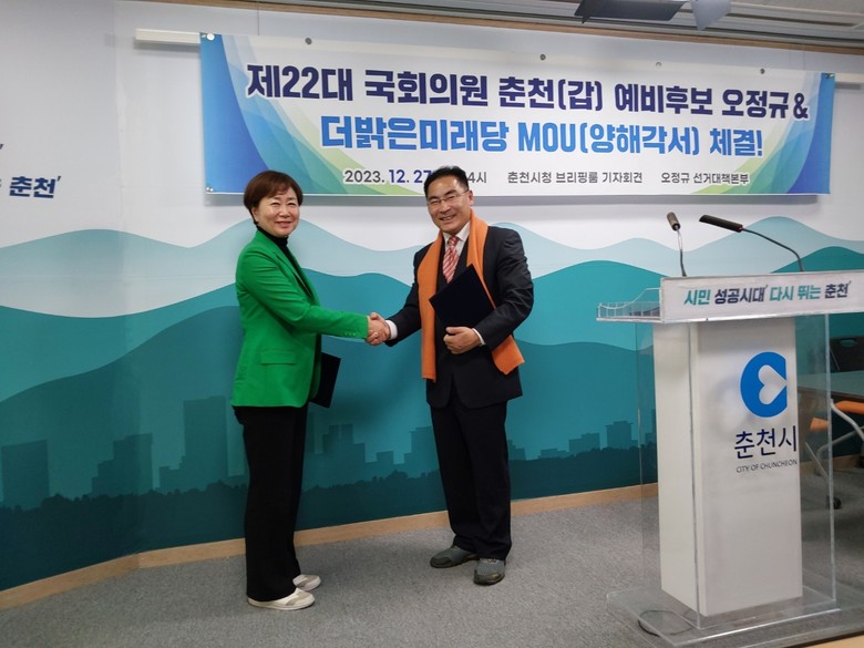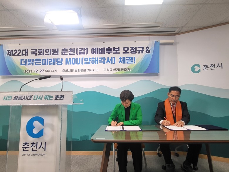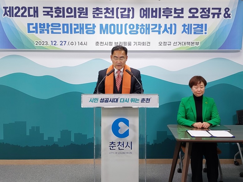 최성룡기자 = 더밝은미래당(대표 서정미)과 오정규 선거대책본부와 각계층 시민단체들은 지난 12월 27일(수) 14시 / 춘천시청 8층 브리핑룸에서 “양해각서 체결” 요지의 기자회견을 진행하였다.