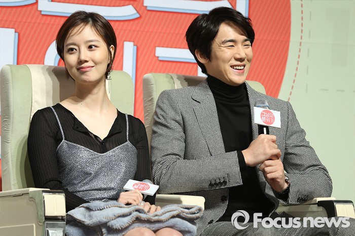 (서울=포커스뉴스) 8일 오전 서울 강남구 압구정 CGV에서 열린 영화 '그날의 분위기' 제작보고회에 참석한 배우 문채원(왼쪽)과 유연석이 기자간담회전 미소를 짓고 있다.