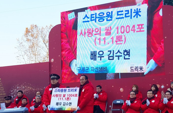| △ 배우 김수현이 지난 1일 서울광장에서 열린 구세군 자선냄비 시종식에서 자선냄비에 사랑의 쌀 1004포(11.1톤)를 기부하고 있다. <사진제공=키이스트> |