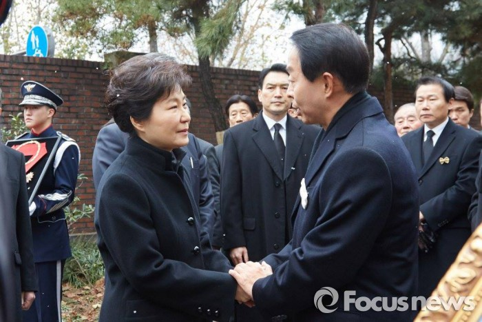 | △ 박근혜 대통령은 26일 첫 국가장으로 거행된 고(故) 김영삼 전 대통령의 영결식에 건강상의 문제로 불참하고, 대신 서울대병원 발인 의식에만 참석했다. 사진은 발인식에서 고인의 차남 현철씨를 위로하는 박 대통령. <사진출처=청와대> |