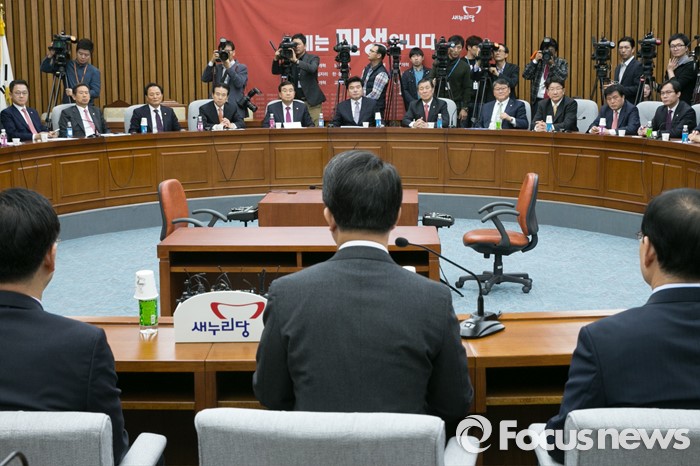 | △ 강신명(앞줄 가운데 뒷모습) 경찰청장이 17일 오전 서울 여의도 국회에서 열린 새누리당 원내대책회의에 출석해 11·14 집회 관련 현안보고를 하고 있다. <사진제공=포커스뉴스> |