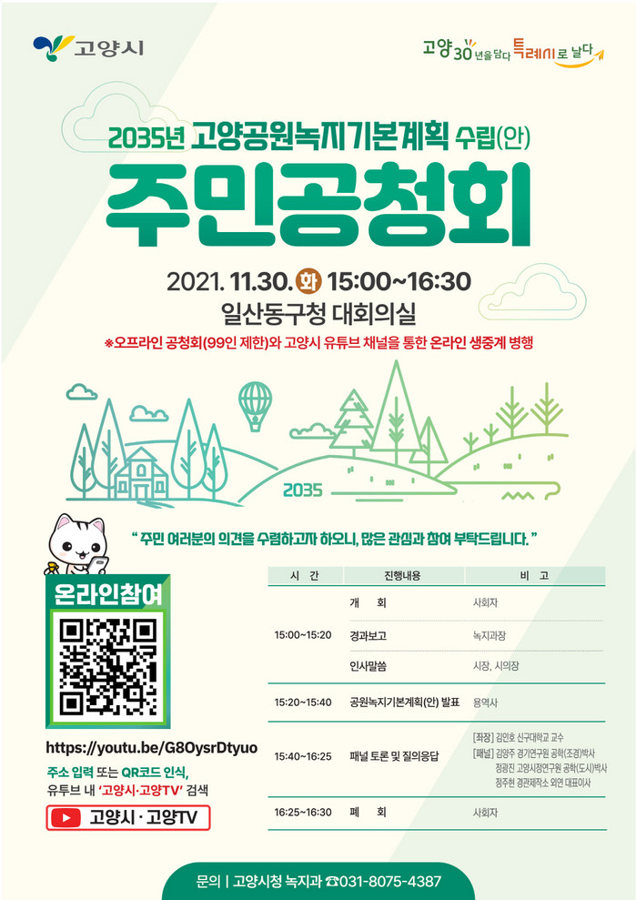 공청회는 2035년까지의 고양시의 미래상 소개, 공원녹지 확충계획을 포함한 2035년 고양 공원녹지기본계획(안) 소개, 전문가 토론, 시민 질의응답 순으로 진행된다.