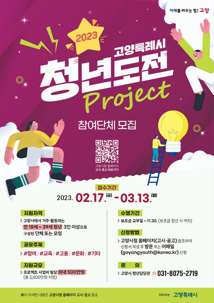 [부자동네타임즈 김인수기자] 고양특례시(시장 이동환)에서 청년도전 프로젝트에 참여할 청년 단체 및 모임을 2월 17일부터 3월 13일까지 공개 모집한다.