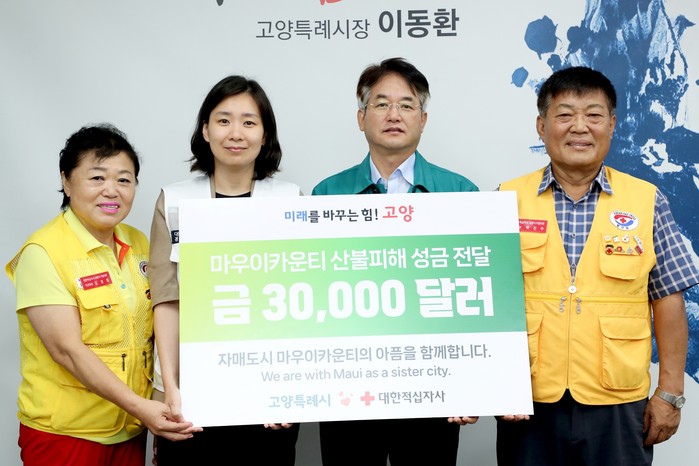이동환 고양특례시장은 “재난구호 성금이 힘든 시기를 보내고 있는 마우이카운티 시민 여러분께 작은 위로와 희망이 되길 바란다. 용기를 잃지 않고 하루 빨리 일상을 되찾기를 기원한다.”고 전했다.
