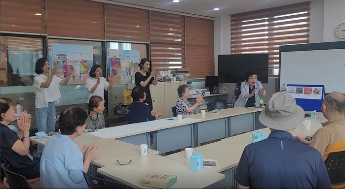 예비 책놀이 지도사들은 일산서구 치매안심센터에서 초기 치매 어르신을 대상으로 실시하는 책놀이 수업에 보조강사로 참여했다. 예비 지도사들은 교육 운영 환경 점검, 출석 확인, 활동 시연(박수, 노래, 율동 등)을 지원하고 상황별 문제 대응 방법을 익혔다.