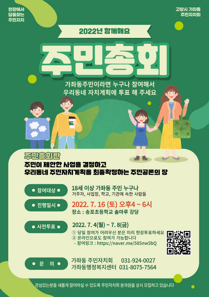 한편 가좌동 주민자치회는 마을 사업 선정을 위해 온 · 오프라인 사전투표를 진행한다. 7월 4일부터 8일까지 5일간 진행되는 온라인 사전투표는 홍보전단지의 QR코드 혹은 참여링크를 통해 가능하며, 현장투표는 가좌동 행정복지센터와 가좌동 왕마트(일산서구 가좌로 30) 등에서 진행된다.