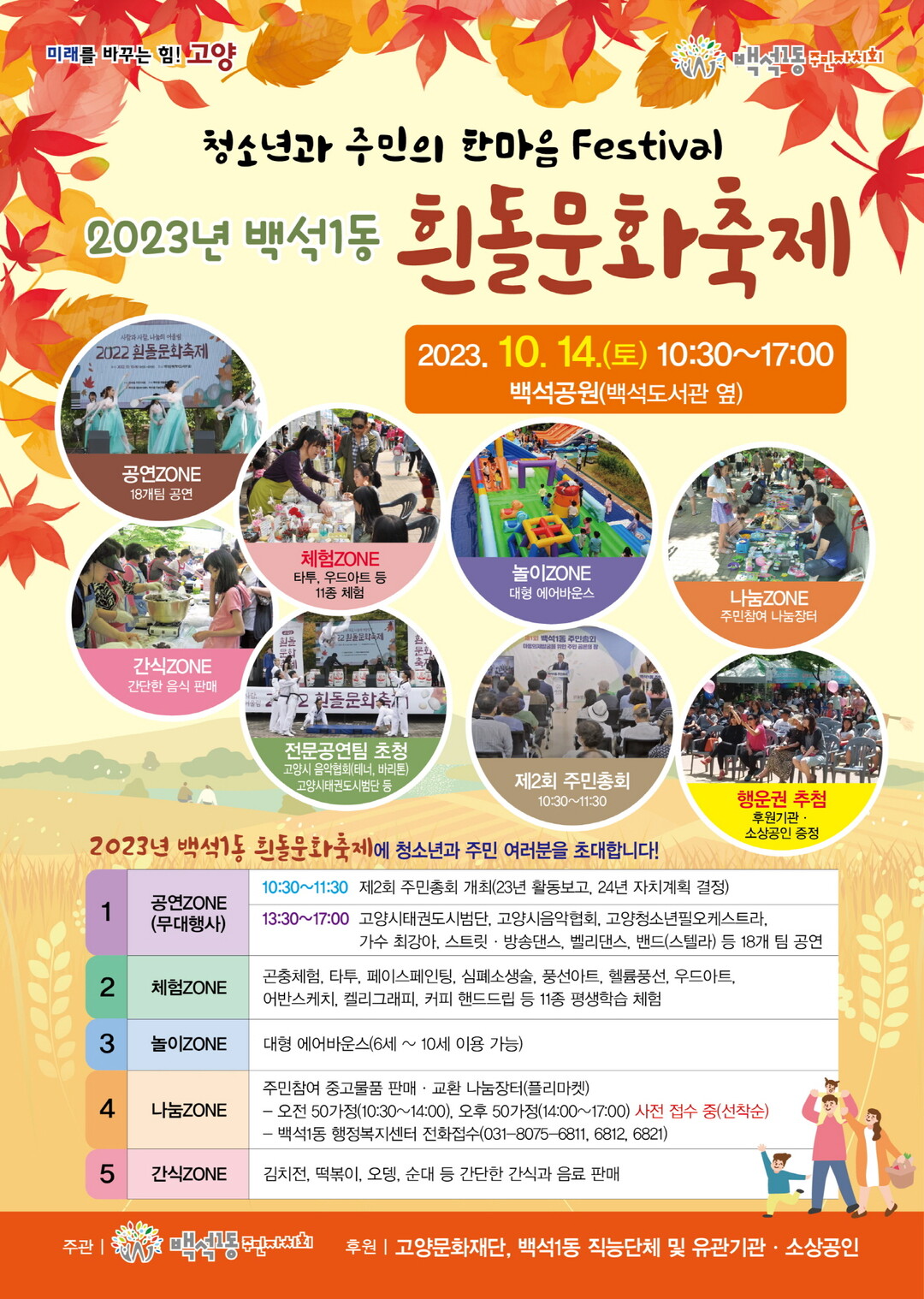 [부자동네타임즈 = 김인수 기자] 고양특례시 백석1동 주민자치회는 오는 10월 14일(토) 오전 10시 30분부터 오후 5시까지 백석공원 광장(백석도서관 옆)에서 ‘청소년과 주민의 한마음 페스티벌(Festival)’을 주제로 ‘2023 흰돌문화축제’를 개최한다.