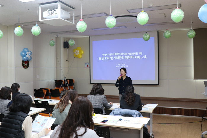 교육은 ▲치매환자 응대법 ▲인지선별검사(CIST) 실시 방법 ▲진단.감별검사 절차 ▲치매환자 맞춤형 사례관리 안내 ▲인고지능(AI)케어콜 ‘말벗 로(老)벗’ 사업 안내 등 치매예방 및 관리의 전반적인 내용을 다뤘다.