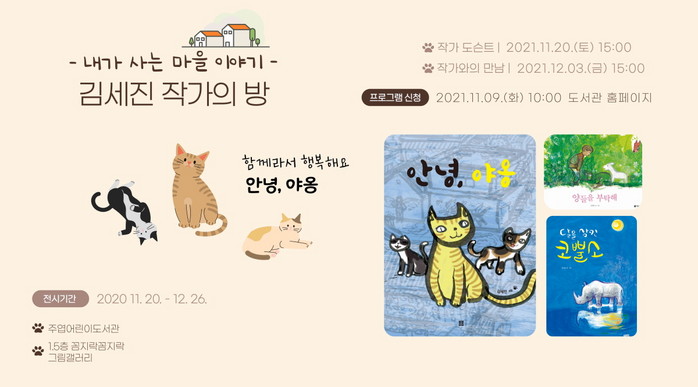 전시 연계 프로그램으로는 11월 20일 작가 도슨트와 12월 3일 작가와의 만남을 운영한다. 작가 도슨트는 갤러리에서 작가가 직접 그림책을 낭독하고 전시 작품 및 창작 배경을 소개한다. 작가와의 만남은 초등 저학년을 대상으로 진행하며 안녕, 야옹그림책 강연과 독후활동으로 ‘우리 마을 지도 그리기’를 진행한다.
