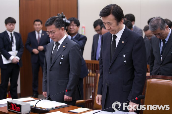 (서울=포커스뉴스) 25일 오전 서울 여의도 국회에서 열린 외교통일위원회 전체회의에 참석한 윤병세 외교부 장관과 홍용표 통일부 장관 등 참석자들이 故 김영삼 전 대통령을 추모하는 묵념을 하고 있다.