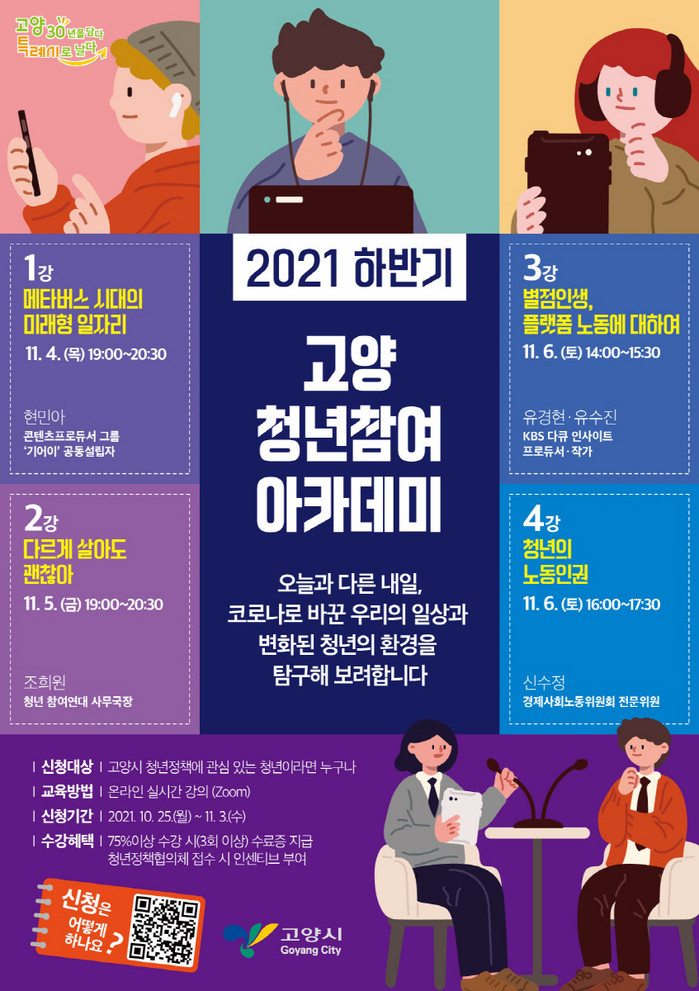 청년참여 아카데미는 고양시 청년정책에 관심 있는 청년이라면 누구나 신청 가능하며 11월 3일(수)까지 포스터 하단의 QR코드(han.gl/tah9P)로 접속하면 된다.