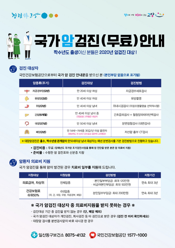 [부자동네타임즈 김인수기자] 고양시(시장 이재준) 일산동구보건소는 2020년 국가암검진 사업이 시작됨에 따라 짝수년도 출생 대상자에 대한 수검 독려 활동에 나셨다.
