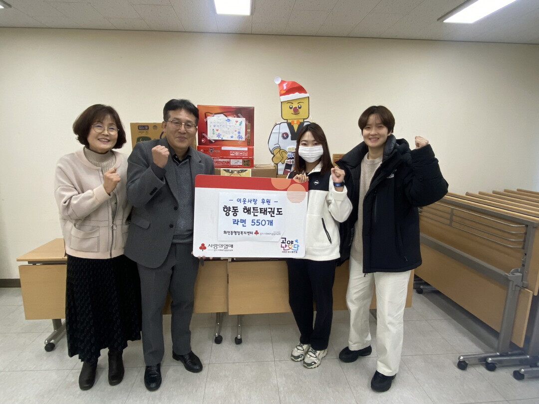 해든 태권도장은 화전동의 어려운 이웃을 위해 원생들이 손수 모아 마련한 후원물품을 작년에 이어 올해도 화전동에 기탁했다. 전달받은 라면은 독거노인 등 취약계층에 전달될 예정이다.