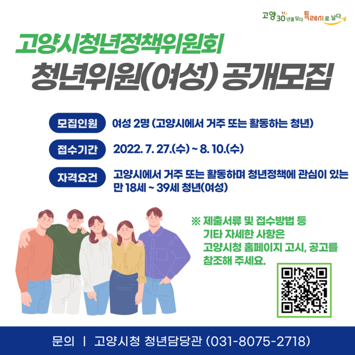 [부자동네타임즈 김인수기자] 고양특례시(시장 이동환)는 오는 8월 10일까지 고양시 청년정책위원회 여성 청년위원 2명을 공개모집한다.