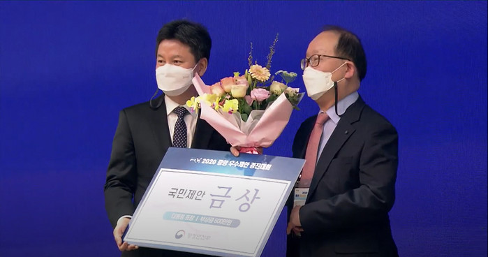 이 중 국민제안, 공무원제안 각 상위 3건은 경진대회 당일인 12일 발표를 통해 금상과 은상을 결정, 김흥식 씨의 제안이 최고 득점을 하며 금상 ‘대통령상’ 수상의 영예를 안고 상금 500만원을 받았다.